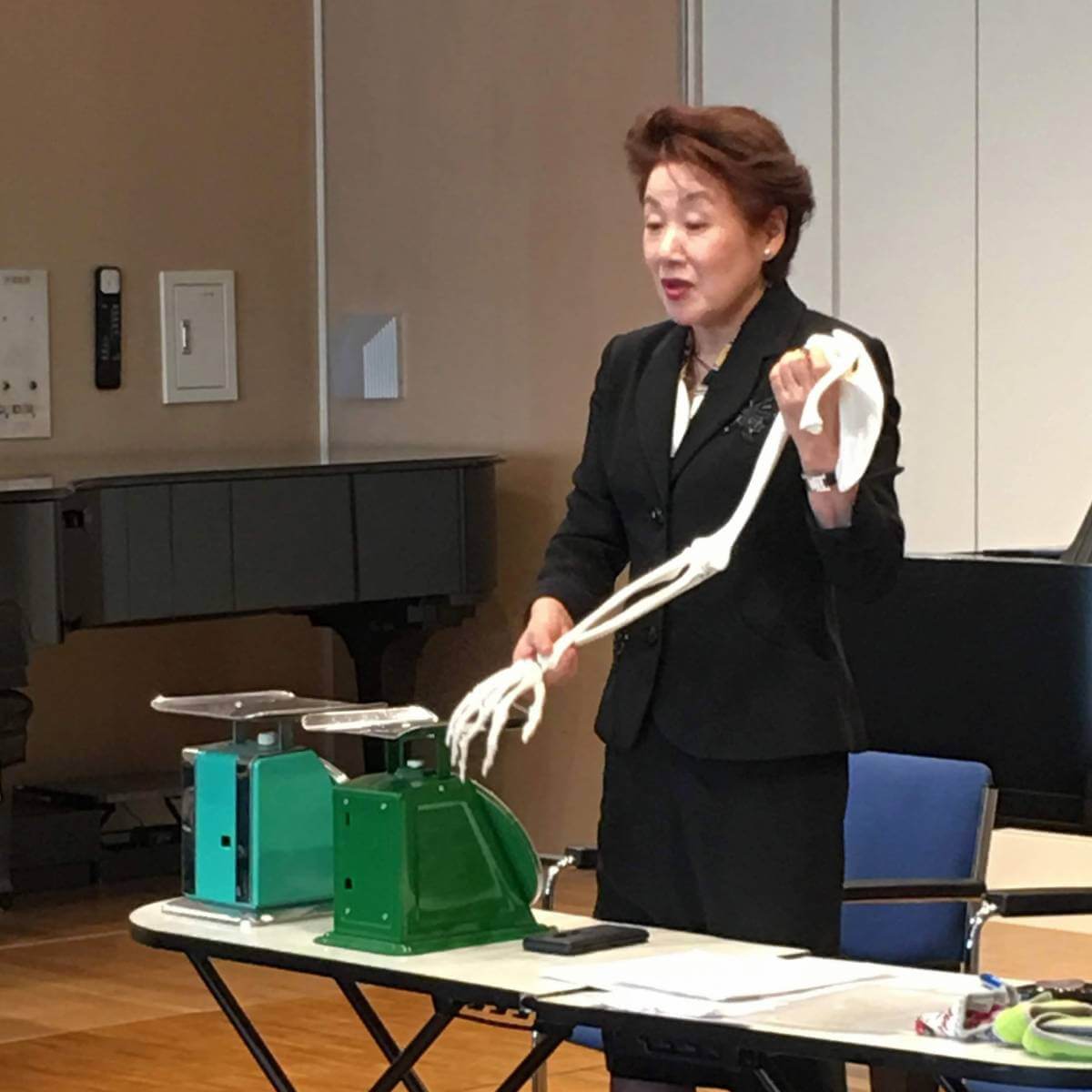 「豊かで深い音量が出せない・・・」という受講生の悩みを聞き、背面から腰にかけて連動して働く筋肉を使って、上腕の重みをたっぷり乗せるトレーニングを指導しています。