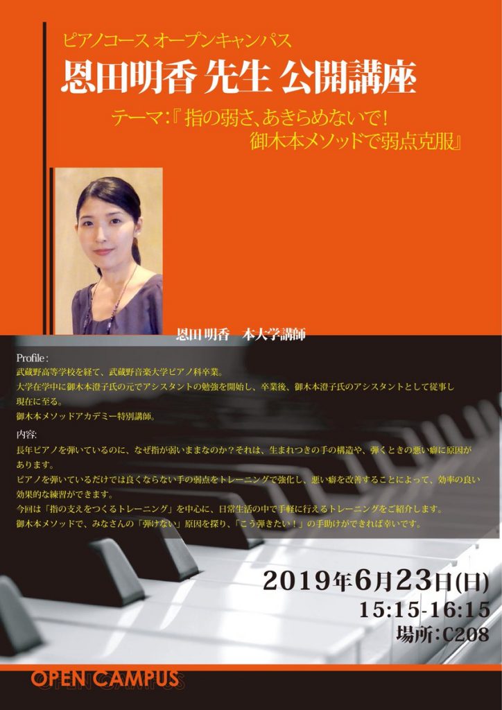 2019年6月23日 (日) に、洗足学園音楽大学のオープンキャンパスで御木本メソッドの講座を行います。